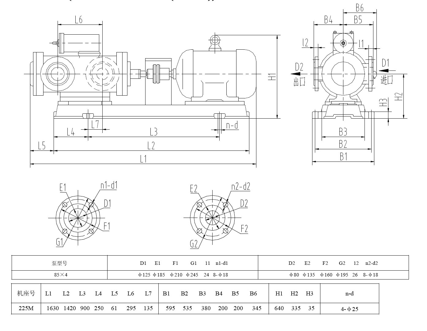 3GR85*4W21三螺杆泵配30kw-6電(diàn)機尺寸圖,該泵(bèng)流量25m3/h,壓力2.5Mpa,軸功(gong)率25.4kw,該泵進口125,出(chū)口80,泵重量為178kg |